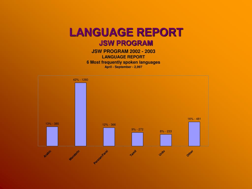 JSW CLIENT OVERVIEW • Majority of clients are one year or less in Canada • 2-6 months following completion of program have found work • Lack Canadian work experience and references • Lack recognition for foreign credentials • Dealing with transitions and losses