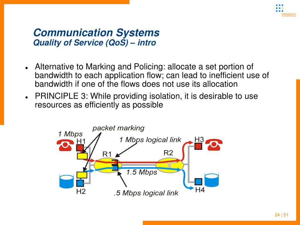 Applications misbehave (audio sends packets at a rate higher than 1Mbit/s assumed above); PRINCIPLE 2: provide protection (isolation) for one class from other classes Require Policing Mechanisms to ensure sources adhere to bandwidth requirements; Marking and Policing need to be done at the edges: Communication SystemsQuality of Service (QoS) – intro 23 | 51