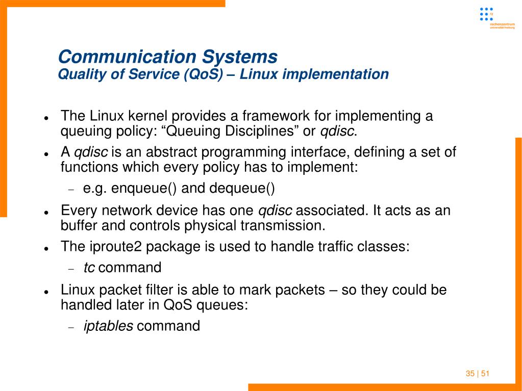 The Linux kernel provides a framework for implementing a queuing policy: “Queuing Disciplines” or qdisc. A qdisc is an abstract programming interface, defining a set of functions which every policy has to implement: e.g. enqueue() and dequeue() Every network device has one qdisc associated. It acts as an buffer and controls physical transmission. The iproute2 package is used to handle traffic classes: tc command Linux packet filter is able to mark packets – so they could be handled later in QoS queues: iptables command Communication SystemsQuality of Service (QoS) – Linux implementation 35 | 51
