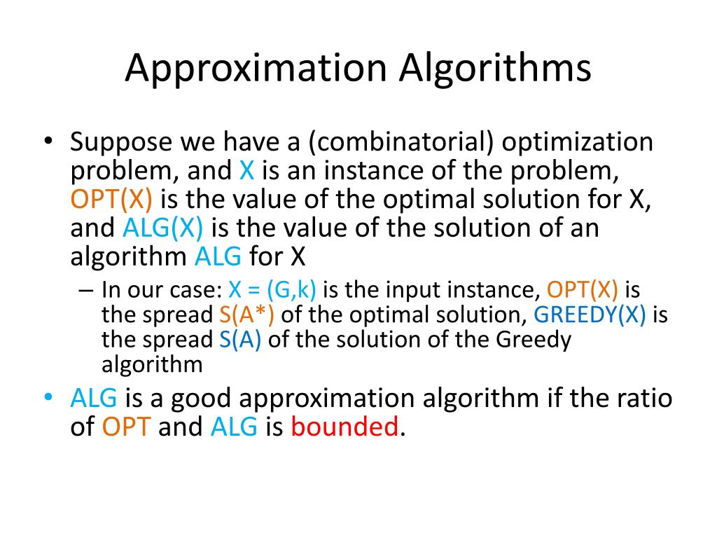 Approximation Algorithms • Suppose we have a (combinatorial) optimization problem, and X is an instance of the problem, OPT(X) is the value of the optimal solution for X, and ALG(X) is the value of the solution of an algorithm ALGfor X • In our case: X = (G,k) is the input instance, OPT(X) is the spread S(A*) of the optimal solution, GREEDY(X) is the spread S(A) of the solution of the Greedy algorithm • ALG is a good approximation algorithm if the ratio of OPT and ALG is bounded.