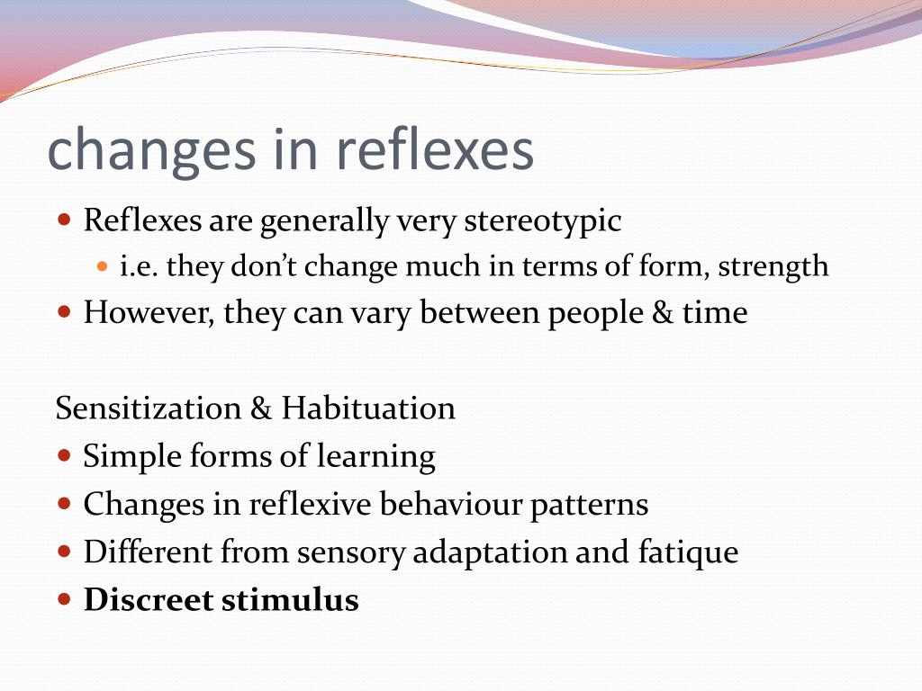 changes in reflexes • Reflexes are generally very stereotypic • i.e. they don’t change much in terms of form, strength • However, they can vary between people & time Sensitization & Habituation • Simple forms of learning • Changes in reflexive behaviour patterns • Different from sensory adaptation and fatique • Discreet stimulus