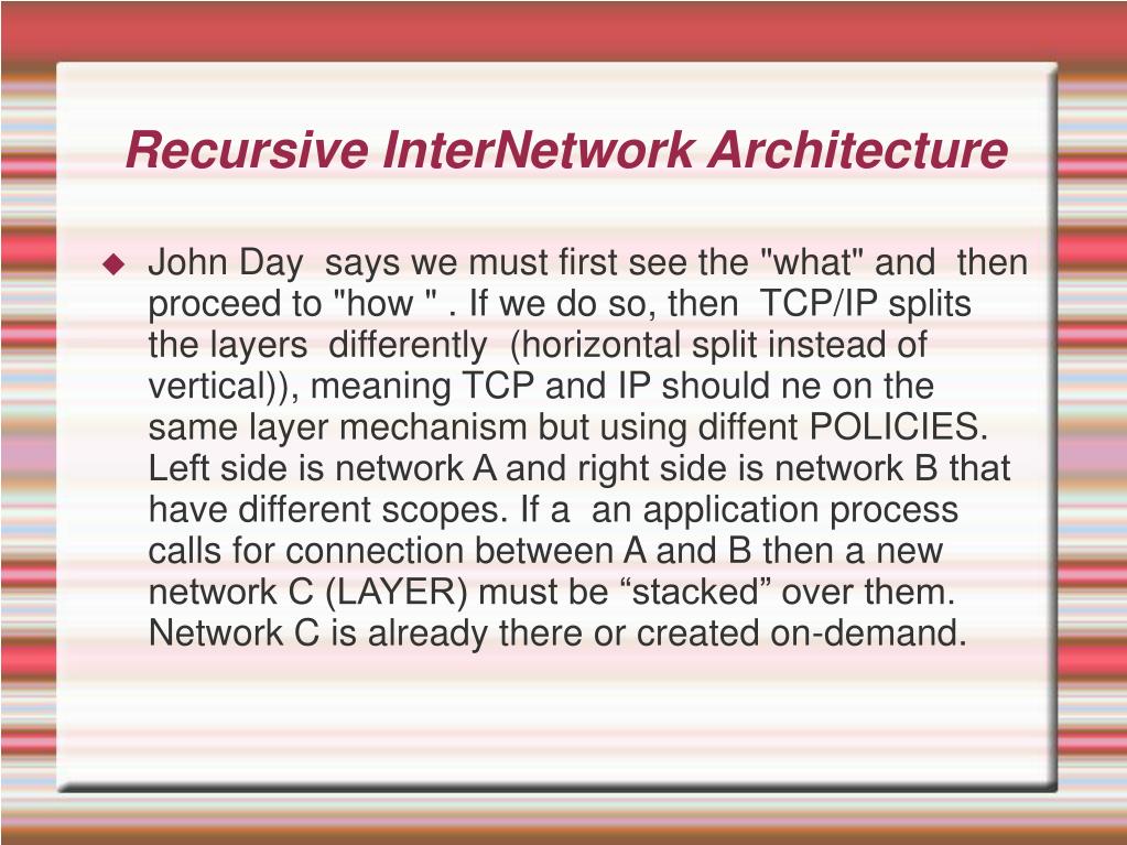 Recursive InterNetwork Architecture • John Day says we must first see the "what" and then proceed to "how " . If we do so, then TCP/IP splits the layers differently (horizontal split instead of vertical)), meaning TCP and IP should ne on the same layer mechanism but using diffent POLICIES. Left side is network Α and right side is network Β that have different scopes. If a an application process calls for connection between A and B then a new network C (LAYER) must be “stacked” over them. Network C is already there or created on-demand.