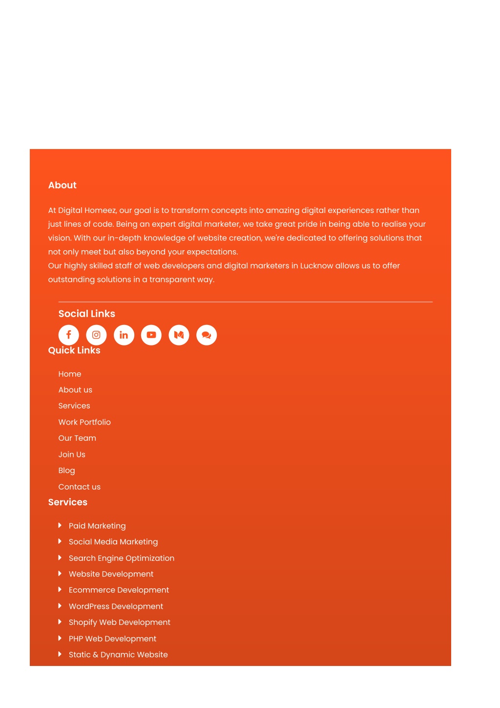 About At Digital Homeez, our goal is to transform concepts into amazing digital experiences rather than just lines of code. Being an expert digital marketer, we take great pride in being able to realise your vision. With our in-depth knowledge of website creation, we're dedicated to offering solutions that not only meet but also beyond your expectations. Our highly skilled staff of web developers and digital marketers in Lucknow allows us to offer outstanding solutions in a transparent way. Social Links Quick Links Home About us Services Work Portfolio Our Team Join Us Blog Contact us Services Paid Marketing Social Media Marketing Search Engine Optimization Website Development Ecommerce Development WordPress Development Shopify Web Development PHP Web Development Static & Dynamic Website