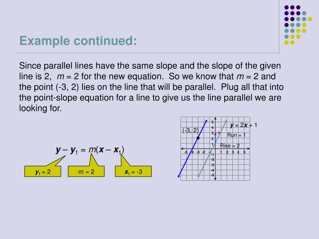 5 y = 2x + 1 y – y1 = m(x – x1) 4 (-3, 2) 3 Run = 1 2 1 Rise = 2 y1 = 2 m= 2 x1 = -3 -5 -4 -3 -2 -1 1 2 3 4 5 -1 -2 -3 -4 -5 Example continued: Since parallel lines have the same slope and the slope of the given line is 2, m = 2 for the new equation. So we know that m = 2 and the point (-3, 2) lies on the line that will be parallel. Plug all that into the point-slope equation for a line to give us the line parallel we are looking for.