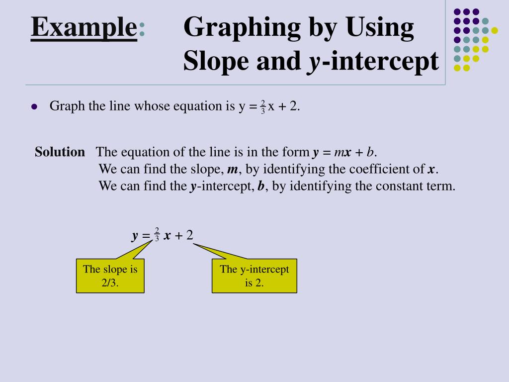The slope is 2/3. The y-intercept is 2. Example: Graphing by Using Slope and y-intercept • Graph the line whose equation is y = x + 2. SolutionThe equation of the line is in the form y = mx + b. We can find the slope, m, by identifying the coefficient of x. We can find the y-intercept, b, by identifying the constant term. y = x + 2
