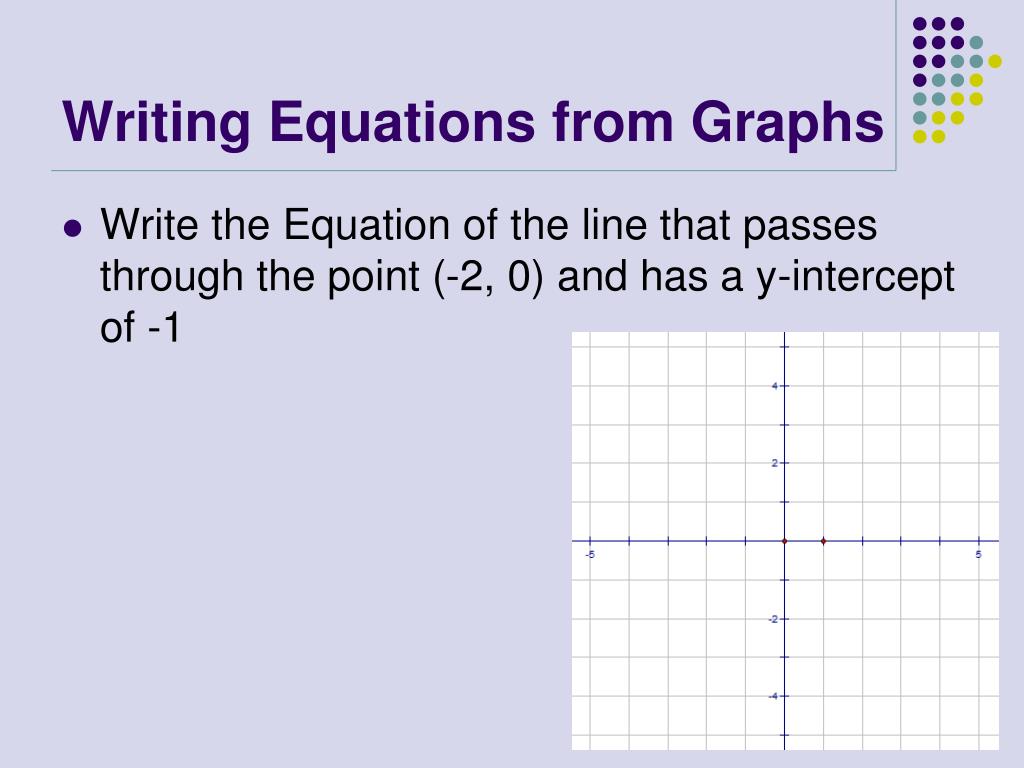 Writing Equations from Graphs • Write the Equation of the line that passes through the point (-2, 0) and has a y-intercept of -1