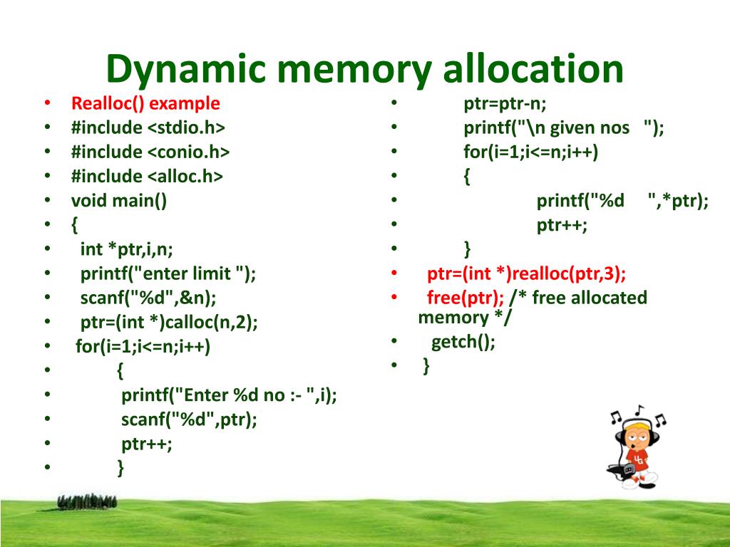Dynamic memory allocation • ptr=ptr-n; • printf("\n given nos "); • for(i=1;i<=n;i++) • { • printf("%d ",*ptr); • ptr++; • } • free(ptr); /* free allocated memory */ • getch(); • } • Calloc() example • #include <stdio.h> • #include <conio.h> • #include <alloc.h> • void main() • { • int *ptr,i,n; • printf("enter limit "); • scanf("%d",&n); • ptr=(int *)calloc(n,2); • for(i=1;i<=n;i++) • { • printf("Enter %d no :- ",i); • scanf("%d",ptr); • ptr++; • }