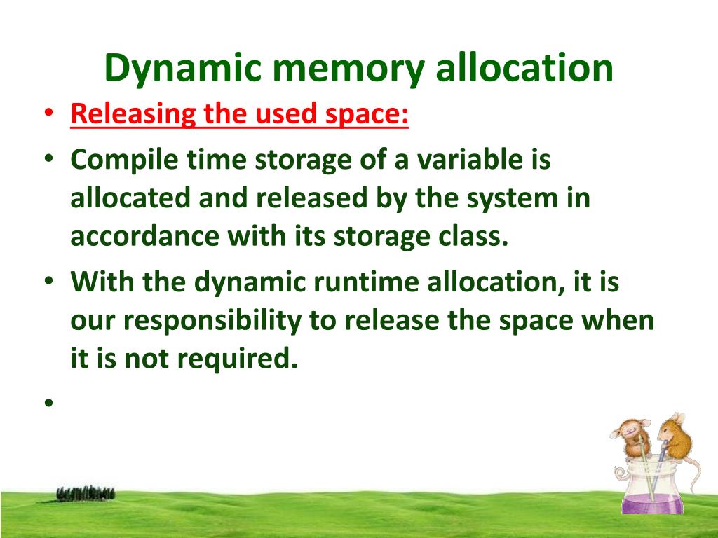 Dynamic memory allocation • Releasing the used space: • Compile time storage of a variable is allocated and released by the system in accordance with its storage class. • With the dynamic runtime allocation, it is our responsibility to release the space when it is not required.