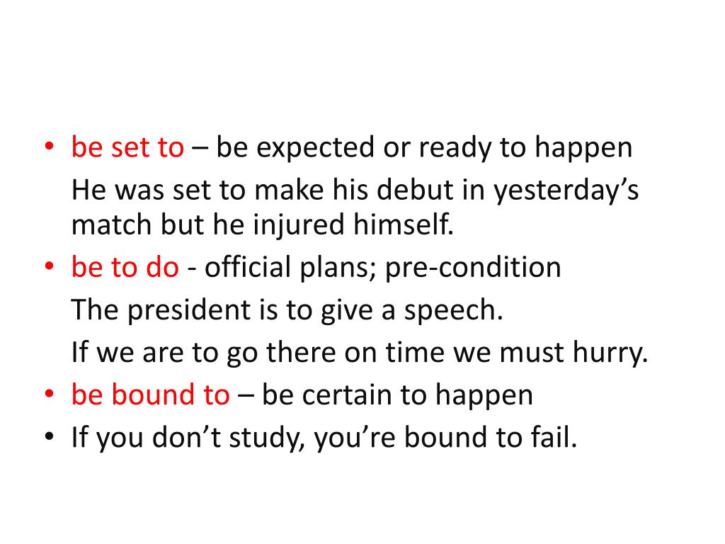 be set to – be expected or ready to happen He was set to make his debut in yesterday’s match but he injured himself. • be to do - official plans; pre-condition The president is to give a speech. If we are to go there on time we must hurry. • be bound to – be certain to happen • If you don’t study, you’re bound to fail.