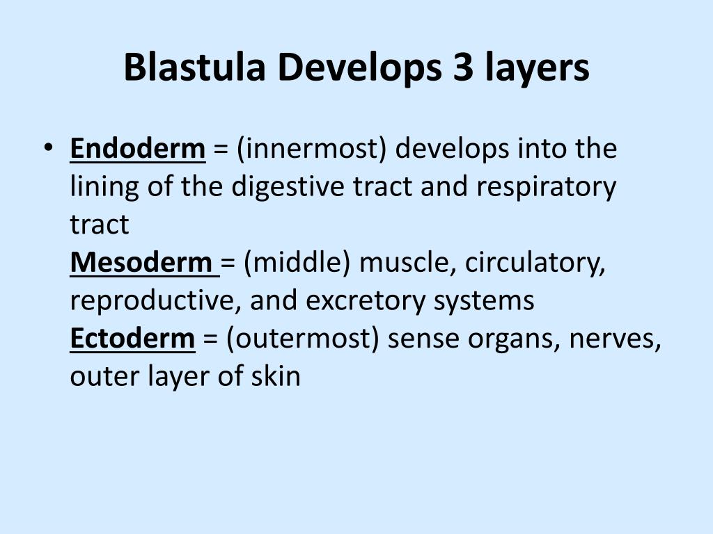 Blastula Develops 3 layers • Endoderm = (innermost) develops into the lining of the digestive tract and respiratory tractMesoderm = (middle) muscle, circulatory, reproductive, and excretory systemsEctoderm = (outermost) sense organs, nerves, outer layer of skin