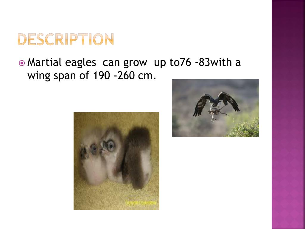 description • Martial eagles can grow up to76 -83with a wing span of 190 -260 cm.