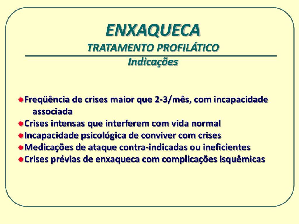 ENXAQUECATRATAMENTO PROFILÁTICOIndicações • Freqüência de crises maior que 2-3/mês, com incapacidade • associada • Crises intensas que interferem com vida normal • Incapacidade psicológica de conviver com crises • Medicações de ataque contra-indicadas ou ineficientes • Crises prévias de enxaqueca com complicações isquêmicas