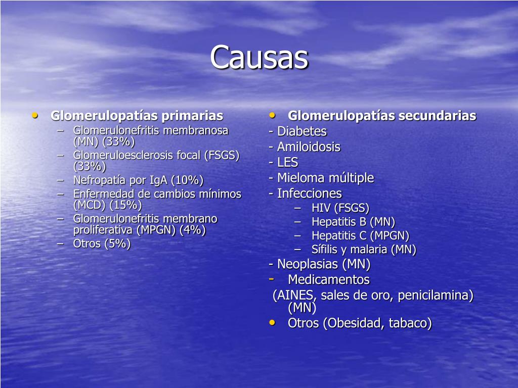 Glomerulopatías primarias Glomerulonefritis membranosa (MN) (33%) Glomeruloesclerosis focal (FSGS) (33%) Nefropatía por IgA (10%) Enfermedad de cambios mínimos (MCD) (15%) Glomerulonefritis membrano proliferativa (MPGN) (4%) Otros (5%) Glomerulopatías secundarias - Diabetes - Amiloidosis - LES - Mieloma múltiple - Infecciones HIV (FSGS) Hepatitis B (MN) Hepatitis C (MPGN) Sífilis y malaria (MN) - Neoplasias (MN) Medicamentos (AINES, sales de oro, penicilamina) (MN) Otros (Obesidad, tabaco) Causas