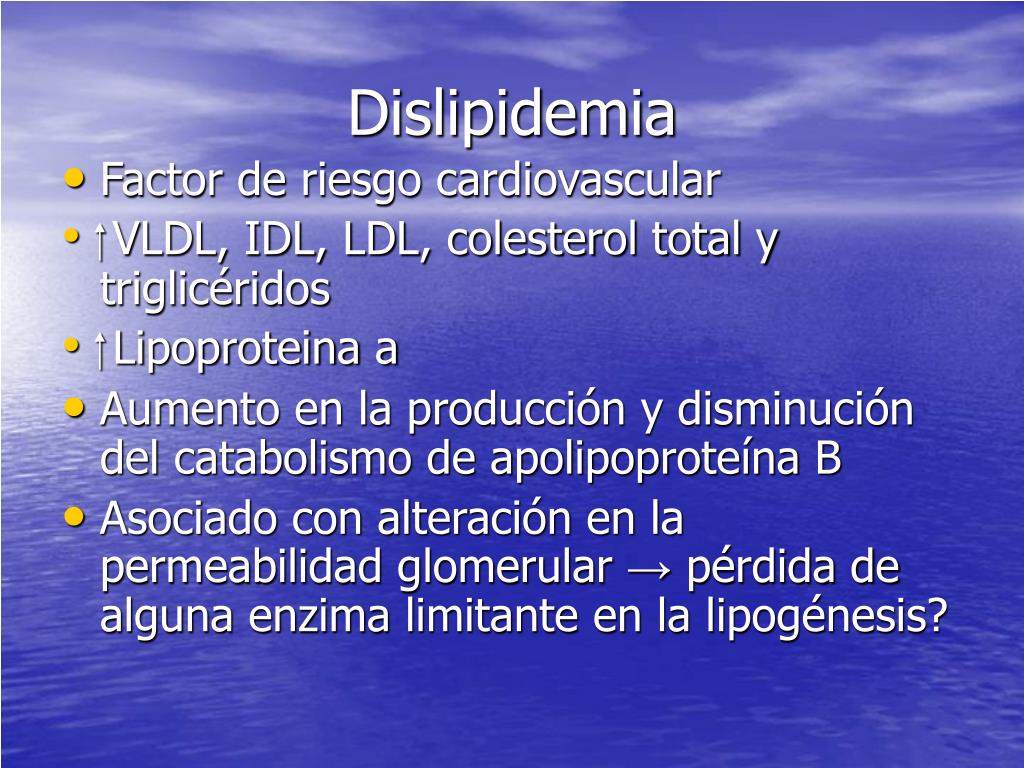 Dislipidemia • Factor de riesgo cardiovascular • VLDL, IDL, LDL, colesterol total y triglicéridos • Lipoproteina a • Aumento en la producción y disminución del catabolismo de apolipoproteína B • Asociado con alteración en la permeabilidad glomerular → pérdida de alguna enzima limitante en la lipogénesis?