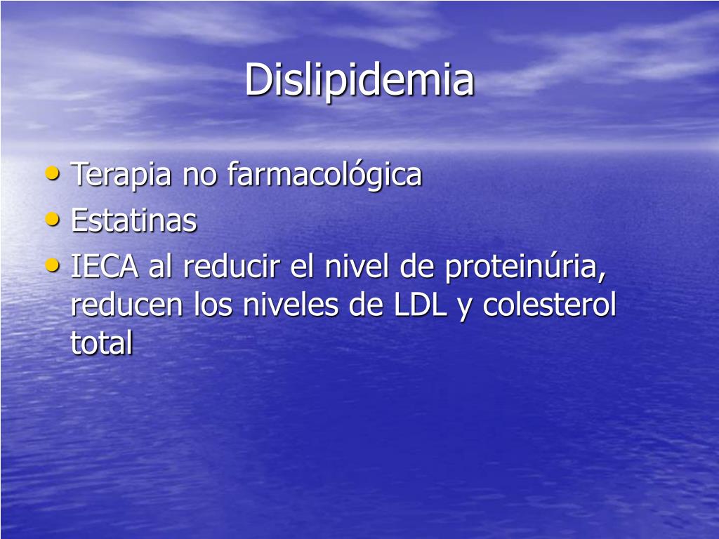 Dislipidemia • Terapia no farmacológica • Estatinas • IECA al reducir el nivel de proteinúria, reducen los niveles de LDL y colesterol total