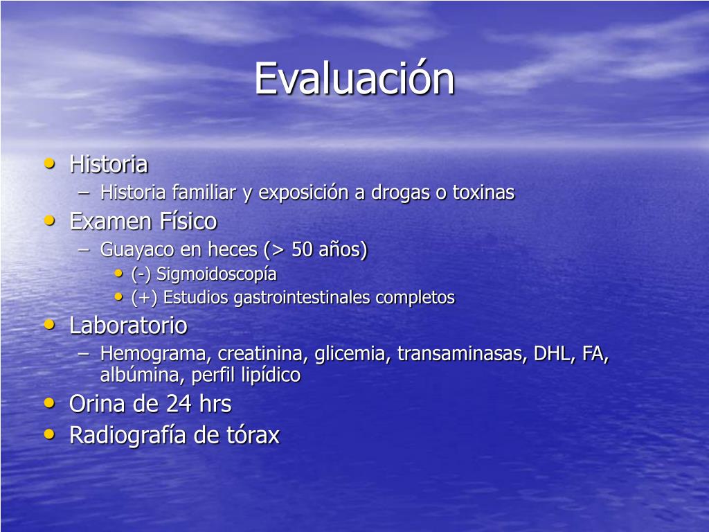 Evaluación • Historia • Historia familiar y exposición a drogas o toxinas • Examen Físico • Guayaco en heces (> 50 años) • (-) Sigmoidoscopía • (+) Estudios gastrointestinales completos • Laboratorio • Hemograma, creatinina, glicemia, transaminasas, DHL, FA, albúmina, perfil lipídico • Orina de 24 hrs • Radiografía de tórax