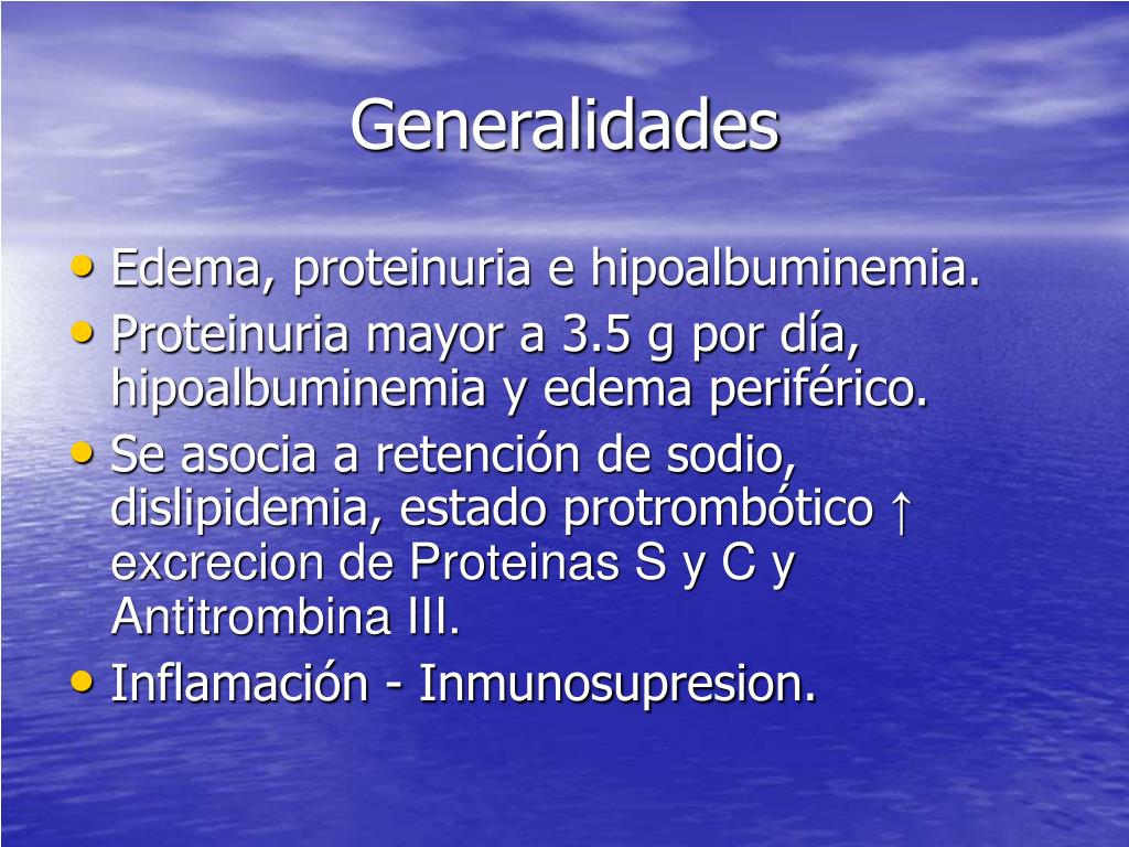 Generalidades • Edema, proteinuria e hipoalbuminemia. • Proteinuria mayor a 3.5 g por día, hipoalbuminemia y edema periférico. • Se asocia a retención de sodio, dislipidemia, estado protrombótico ↑ excrecion de Proteinas S y C y Antitrombina III. • Inflamación - Inmunosupresion.