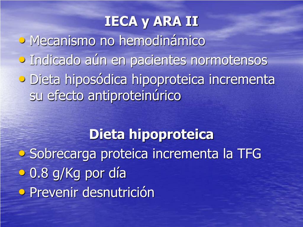 IECA y ARA II • Mecanismo no hemodinámico • Indicado aún en pacientes normotensos • Dieta hiposódica hipoproteica incrementa su efecto antiproteinúrico Dieta hipoproteica • Sobrecarga proteica incrementa la TFG • 0.8 g/Kg por día • Prevenir desnutrición