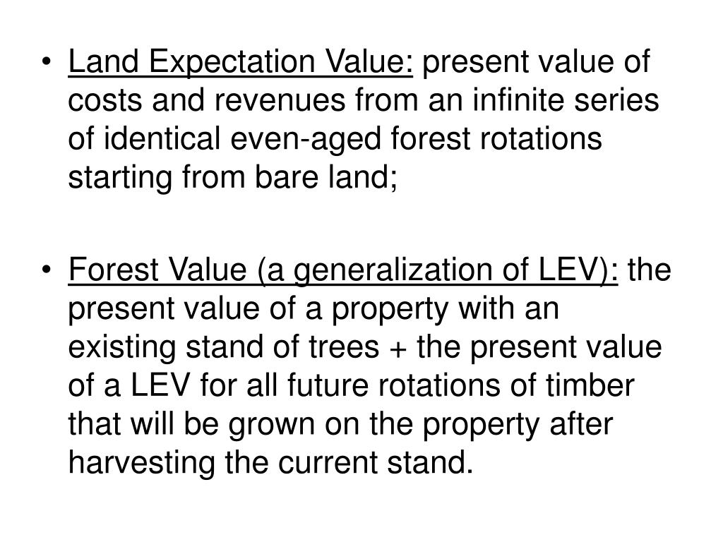Land Expectation Value: present value of costs and revenues from an infinite series of identical even-aged forest rotations starting from bare land; • Forest Value (a generalization of LEV): the present value of a property with an existing stand of trees + the present value of a LEV for all future rotations of timber that will be grown on the property after harvesting the current stand.