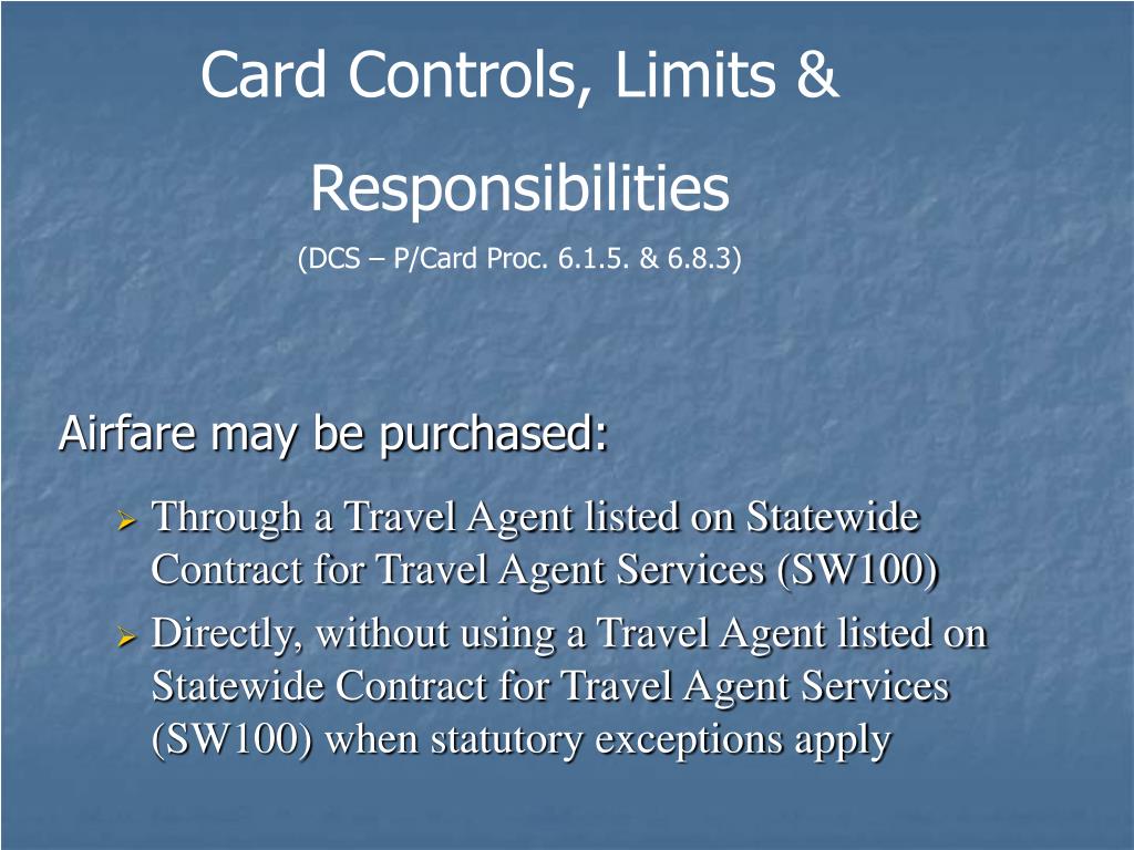 Airfare may be purchased: Through a Travel Agent listed on Statewide Contract for Travel Agent Services (SW100) Directly, without using a Travel Agent listed on Statewide Contract for Travel Agent Services (SW100) when statutory exceptions apply Card Controls, Limits & Responsibilities (DCS – P/Card Proc. 6.1.5. & 6.8.3)