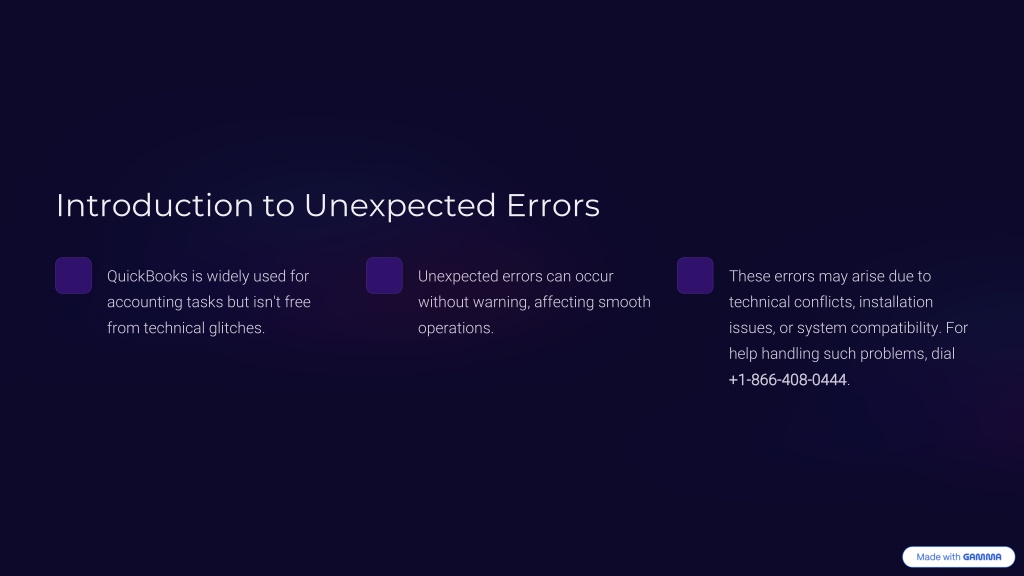 Summary & Next Steps • Unexpected errors in QuickBooks can stall financial management. • Understanding causes, impacts, and remedies is crucial. • Businesses should adopt both preventive and corrective measures. Quick assistance is just a call away at +1-866-408-0444.