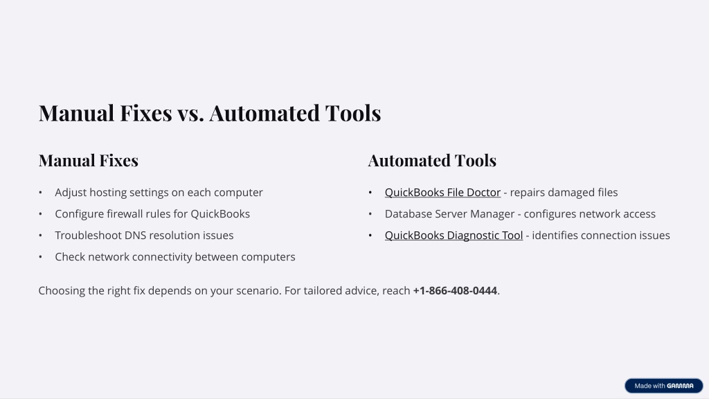 Manual Fixes vs. Automated Tools Manual Fixes Automated Tools • Adjust hosting settings on each computer QuickBooks File Doctor - repairs damaged files • Configure firewall rules for QuickBooks • Database Server Manager - configures network access • Troubleshoot DNS resolution issues QuickBooks Diagnostic Tool - identifies connection issues • Check network connectivity between computers Choosing the right fix depends on your scenario. For tailored advice, reach +1-866-408-0444.