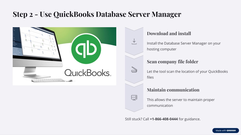 Step 2 - Use QuickBooks Database Server Manager Download and install Install the Database Server Manager on your hosting computer Scan company file folder Let the tool scan the location of your QuickBooks files Maintain communication This allows the server to maintain proper communication Still stuck? Call +1-866-408-0444 for guidance.