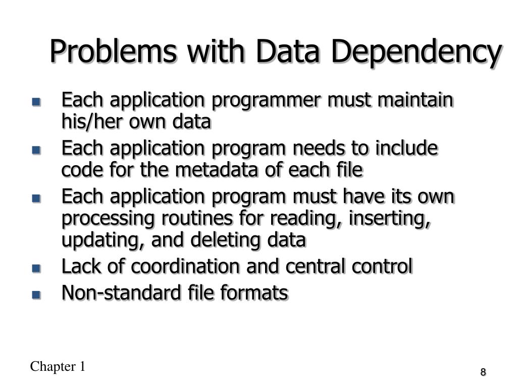 Problems with Data Dependency • Each application programmer must maintain his/her own data • Each application program needs to include code for the metadata of each file • Each application program must have its own processing routines for reading, inserting, updating, and deleting data • Lack of coordination and central control • Non-standard file formats