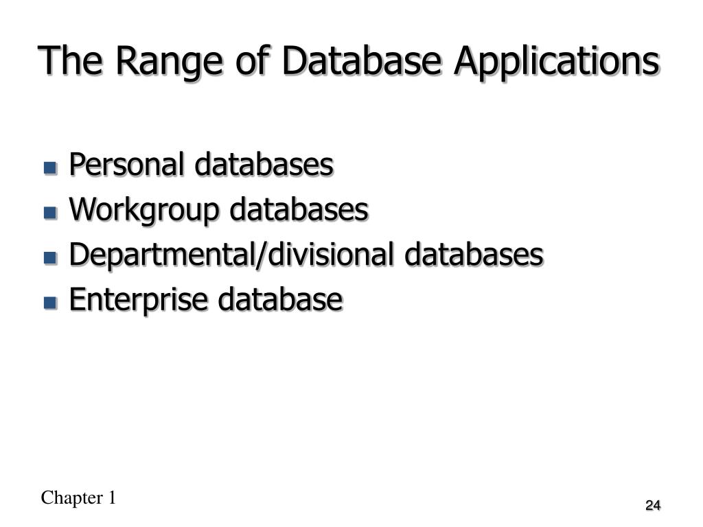 The Range of Database Applications • Personal databases • Workgroup databases • Departmental/divisional databases • Enterprise database