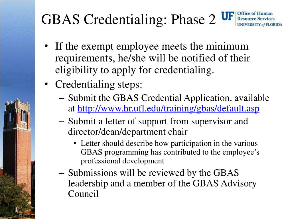 GBAS Credentialing: Phase 2 • If the exempt employee meets the minimum requirements, he/she will be notified of their eligibility to apply for credentialing. • Credentialing steps: • Submit the GBAS Credential Application, available at http://www.hr.ufl.edu/training/gbas/default.asp • Submit a letter of support from supervisor and director/dean/department chair • Letter should describe how participation in the various GBAS programming has contributed to the employee’s professional development • Submissions will be reviewed by the GBAS leadership and a member of the GBAS Advisory Council