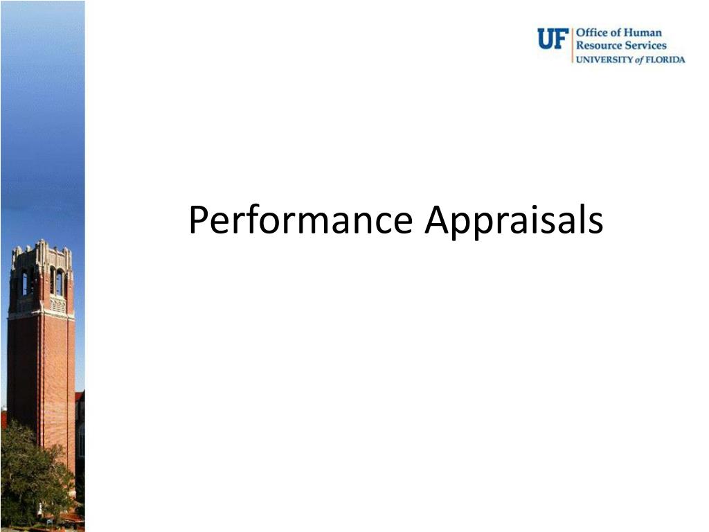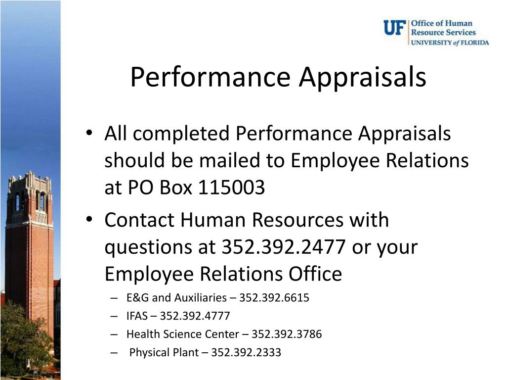 Performance Appraisals • All completed Performance Appraisals should be mailed to Employee Relations at PO Box 115003 • Contact Human Resources with questions at 352.392.2477 or your Employee Relations Office • E&G and Auxiliaries – 352.392.6615 • IFAS – 352.392.4777 • Health Science Center – 352.392.3786 • Physical Plant – 352.392.2333