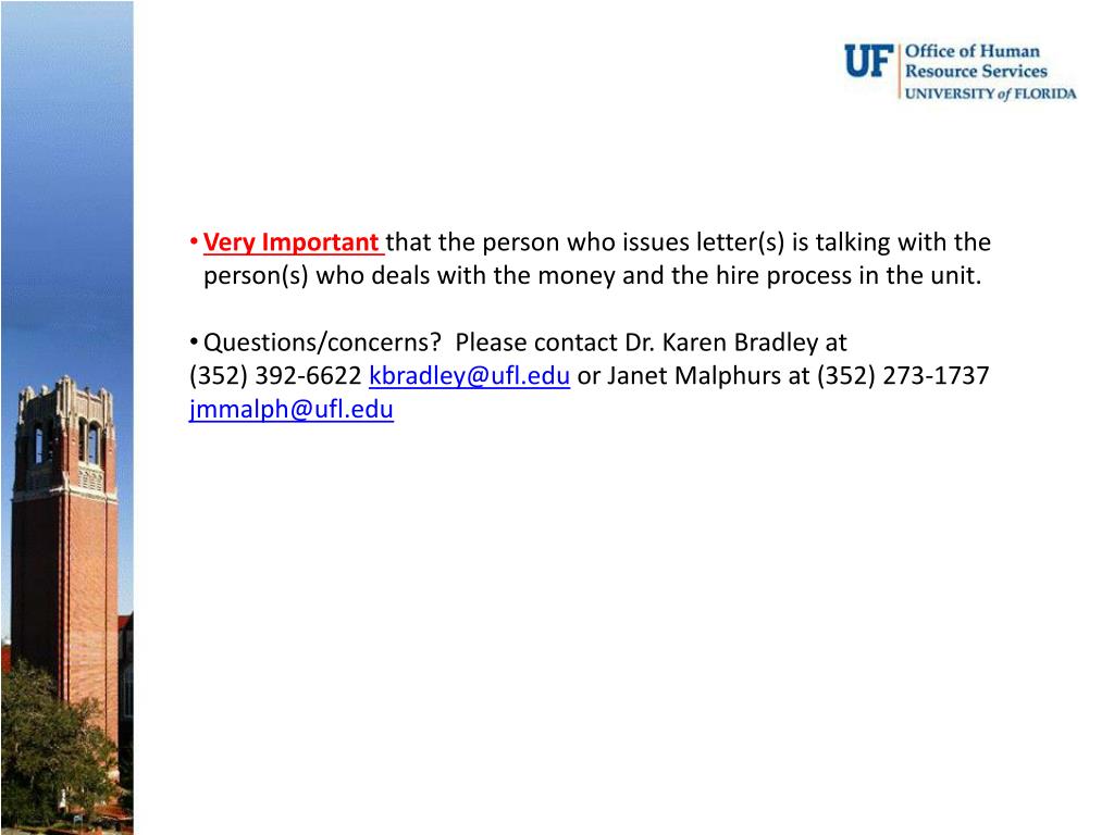 Very Important that the person who issues letter(s) is talking with the person(s) who deals with the money and the hire process in the unit. • Questions/concerns? Please contact Dr. Karen Bradley at • (352) 392-6622 kbradley@ufl.edu or Janet Malphurs at (352) 273-1737 jmmalph@ufl.edu