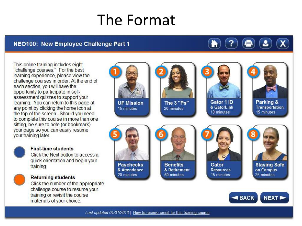 The Challenge Begins! • Released on Friday, February 1 • NEO100 New Employee Challenge Part 1http://hr.ufl.edu/training/nec1/index.html • NEO200 New Employee Challenge Part 2 http://hr.ufl.edu/training/nec2/index.html • New employees must complete both online sessions to substitute for the classroom session.