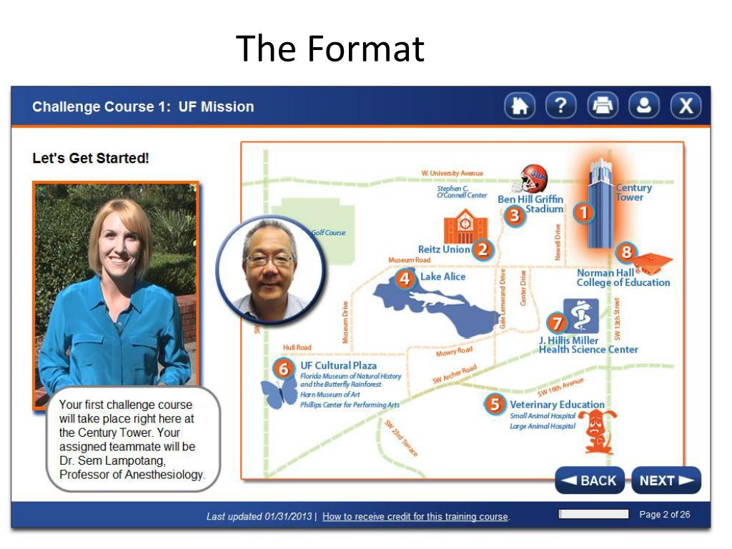 The Premise • How can we offer new employee orientation in the most efficient, helpful, and dynamic way possible? • Leverage online technology • Package content in a “game-like” format • Tell the “story of UF” through real employees • Intro Video
