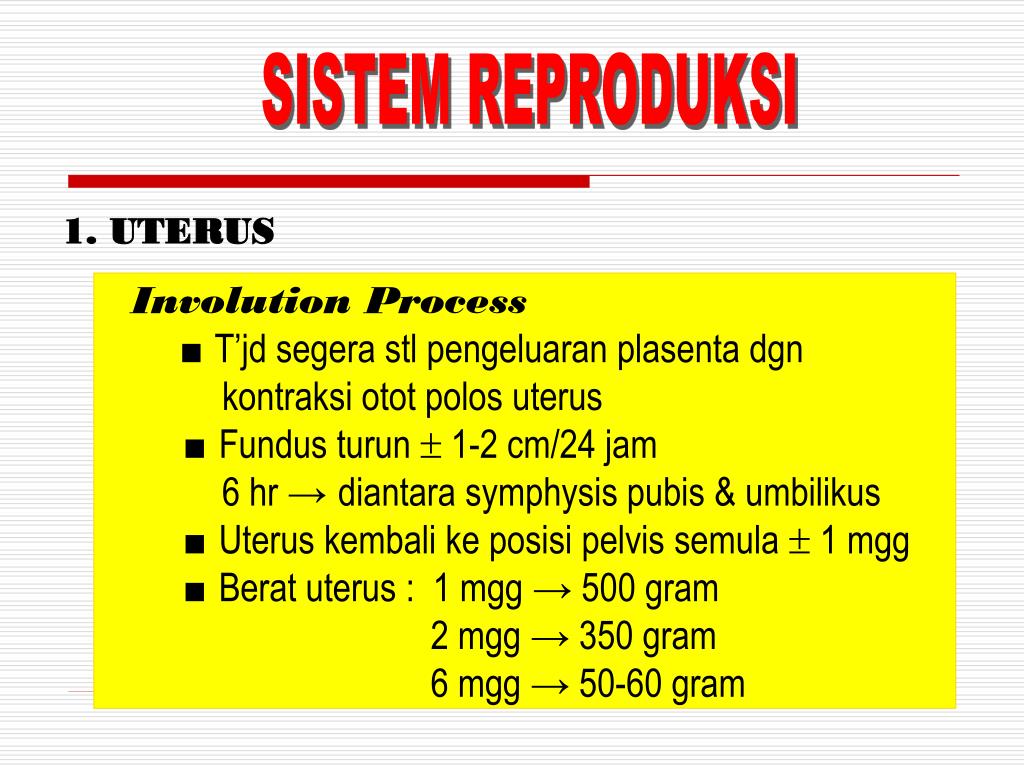 SISTEM REPRODUKSI 1. UTERUS Involution Process ■ T’jd segera stl pengeluaran plasenta dgn kontraksi otot polos uterus ■ Fundus turun 1-2 cm/24 jam 6 hr →diantara symphysis pubis & umbilikus ■ Uterus kembali ke posisi pelvis semula 1 mgg ■ Berat uterus : 1 mgg → 500 gram 2 mgg → 350 gram 6 mgg → 50-60 gram