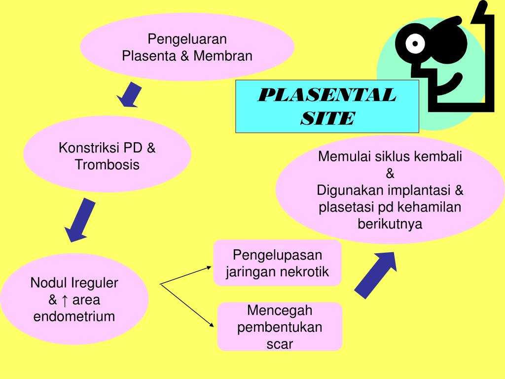 Pengeluaran Plasenta & Membran PLASENTAL SITE Konstriksi PD & Trombosis Memulai siklus kembali & Digunakan implantasi & plasetasi pd kehamilan berikutnya Pengelupasan jaringan nekrotik Nodul Ireguler & ↑ area endometrium Mencegah pembentukan scar