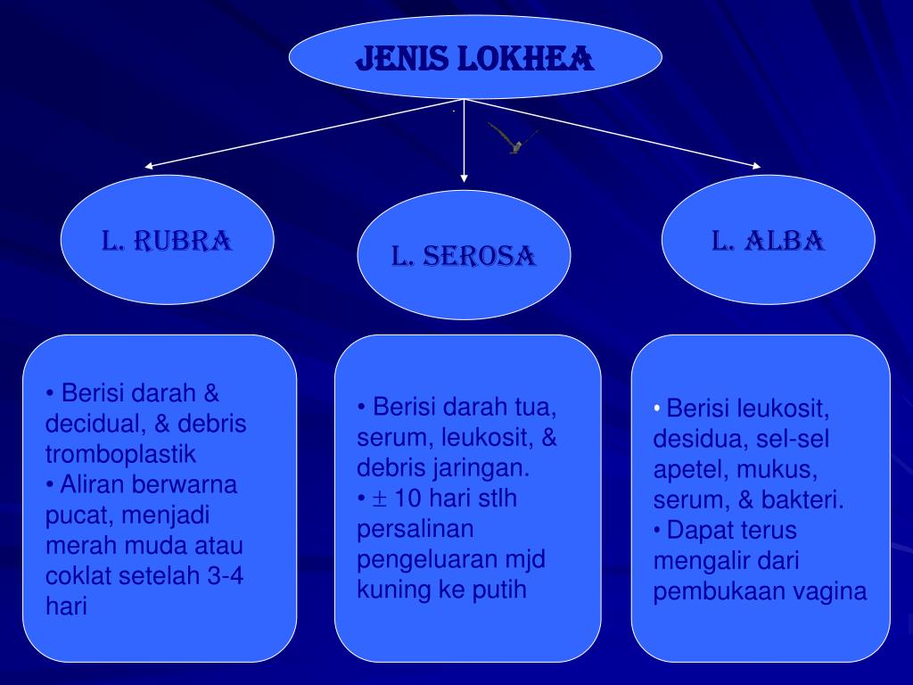 JENIS LOKHEA l. rUBRA L. ALBA l. sEROSA • Berisi darah & decidual, & debris tromboplastik • Aliran berwarna pucat, menjadi merah muda atau coklat setelah 3-4 hari • Berisi darah tua, serum, leukosit, & debris jaringan. • 10 hari stlh persalinan pengeluaran mjd kuning ke putih • Berisi leukosit, desidua, sel-sel apetel, mukus, serum, & bakteri. • Dapat terus mengalir dari pembukaan vagina
