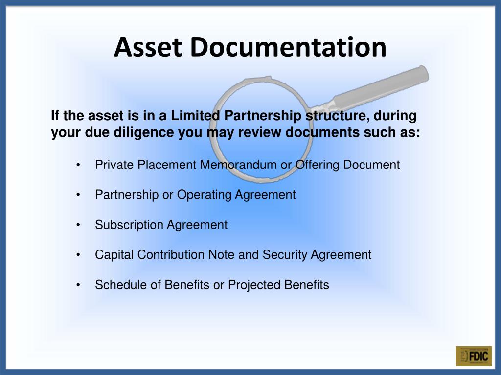 Asset Documentation • If the asset is in a Limited Partnership structure, during your due diligence you may review documents such as: • Private Placement Memorandum or Offering Document • Partnership or Operating Agreement • Subscription Agreement • Capital Contribution Note and Security Agreement • Schedule of Benefits or Projected Benefits