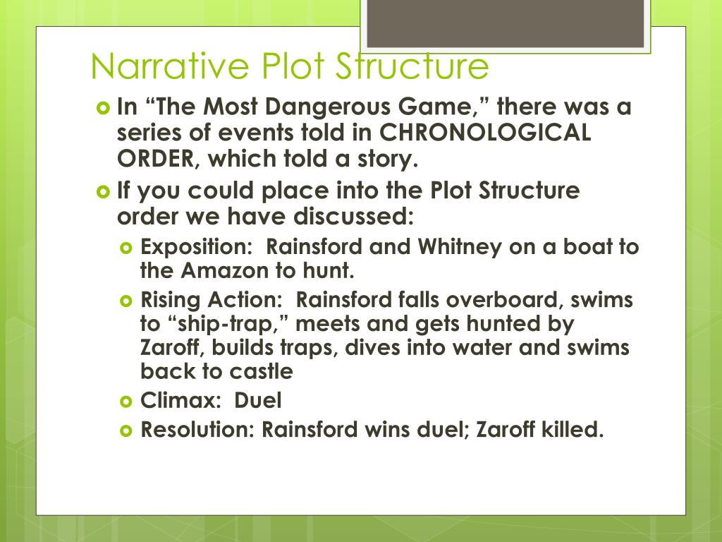 Narrative Plot Structure • In “The Most Dangerous Game,” there was a series of events told in CHRONOLOGICAL ORDER, which told a story. • If you could place into the Plot Structure order we have discussed: • Exposition: Rainsford and Whitney on a boat to the Amazon to hunt. • Rising Action: Rainsford falls overboard, swims to “ship-trap,” meets and gets hunted by Zaroff, builds traps, dives into water and swims back to castle • Climax: Duel • Resolution: Rainsford wins duel; Zaroff killed.
