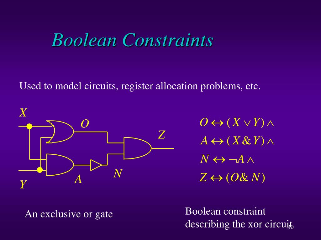 Boolean Constraints Used to model circuits, register allocation problems, etc. Boolean constraint describing the xor circuit An exclusive or gate