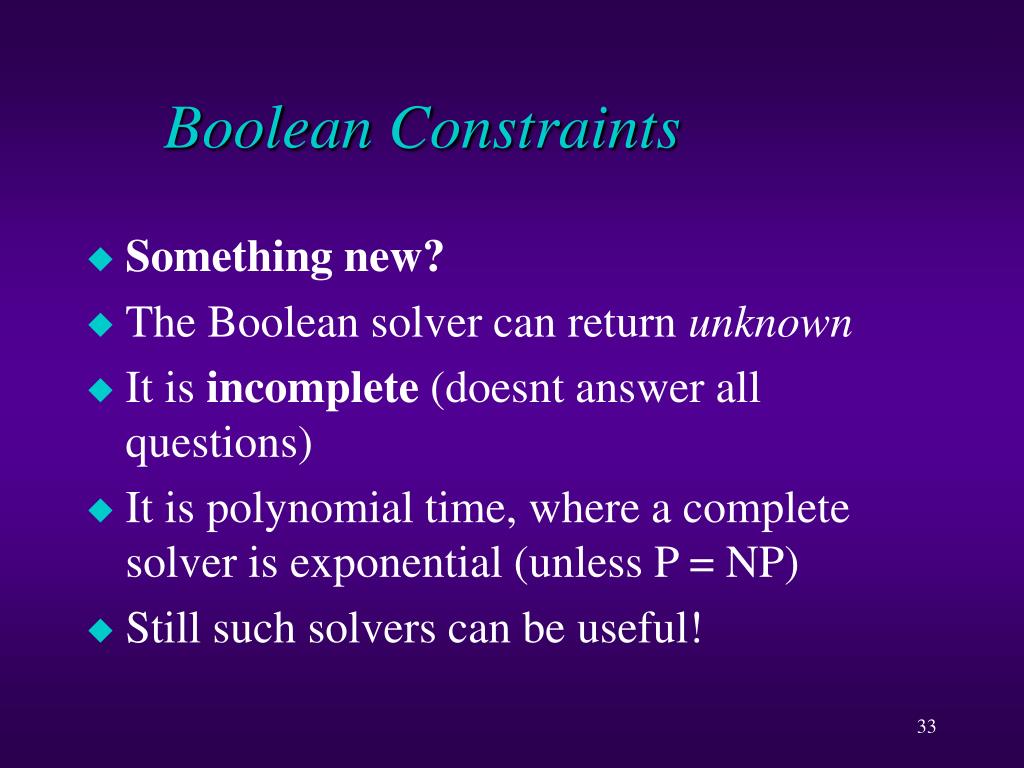 Boolean Constraints • Something new? • The Boolean solver can return unknown • It is incomplete (doesnt answer all questions) • It is polynomial time, where a complete solver is exponential (unless P = NP) • Still such solvers can be useful!