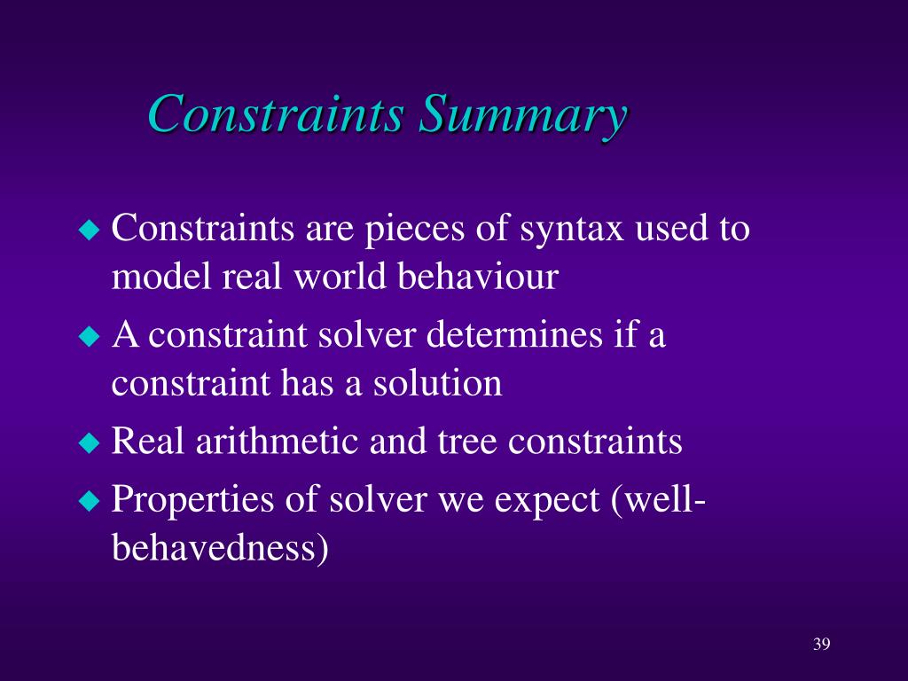 Constraints Summary • Constraints are pieces of syntax used to model real world behaviour • A constraint solver determines if a constraint has a solution • Real arithmetic and tree constraints • Properties of solver we expect (well-behavedness)