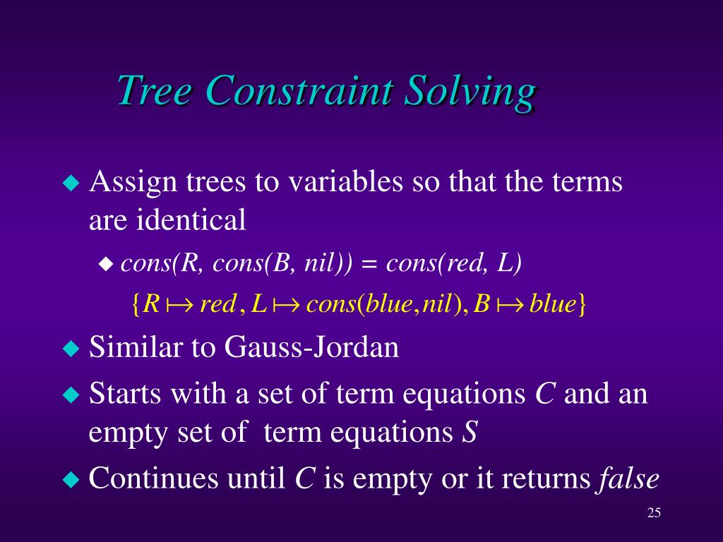Tree Constraint Solving • Assign trees to variables so that the terms are identical • cons(R, cons(B, nil)) = cons(red, L) • Similar to Gauss-Jordan • Starts with a set of term equations C and an empty set of term equations S • Continues until C is empty or it returns false