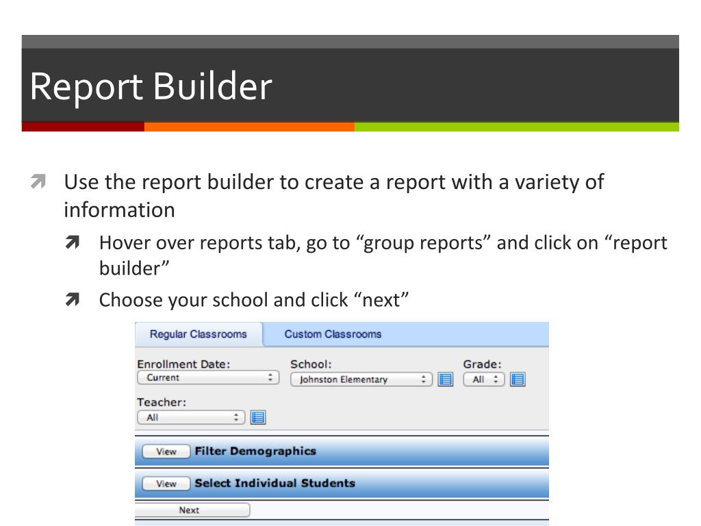 Report Builder • Use the report builder to create a report with a variety of information • Hover over reports tab, go to “group reports” and click on “report builder” • Choose your school and click “next”