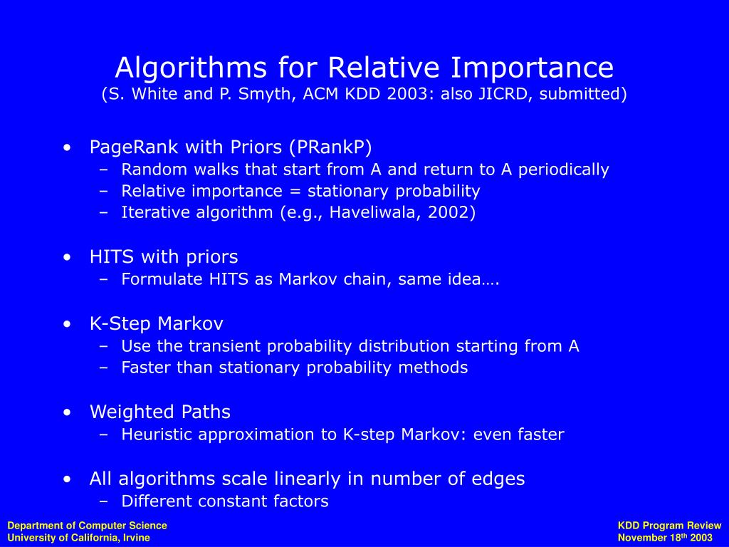 Algorithms for Relative Importance(S. White and P. Smyth, ACM KDD 2003: also JICRD, submitted) • PageRank with Priors (PRankP) • Random walks that start from A and return to A periodically • Relative importance = stationary probability • Iterative algorithm (e.g., Haveliwala, 2002) • HITS with priors • Formulate HITS as Markov chain, same idea…. • K-Step Markov • Use the transient probability distribution starting from A • Faster than stationary probability methods • Weighted Paths • Heuristic approximation to K-step Markov: even faster • All algorithms scale linearly in number of edges • Different constant factors
