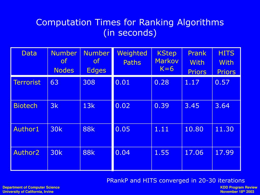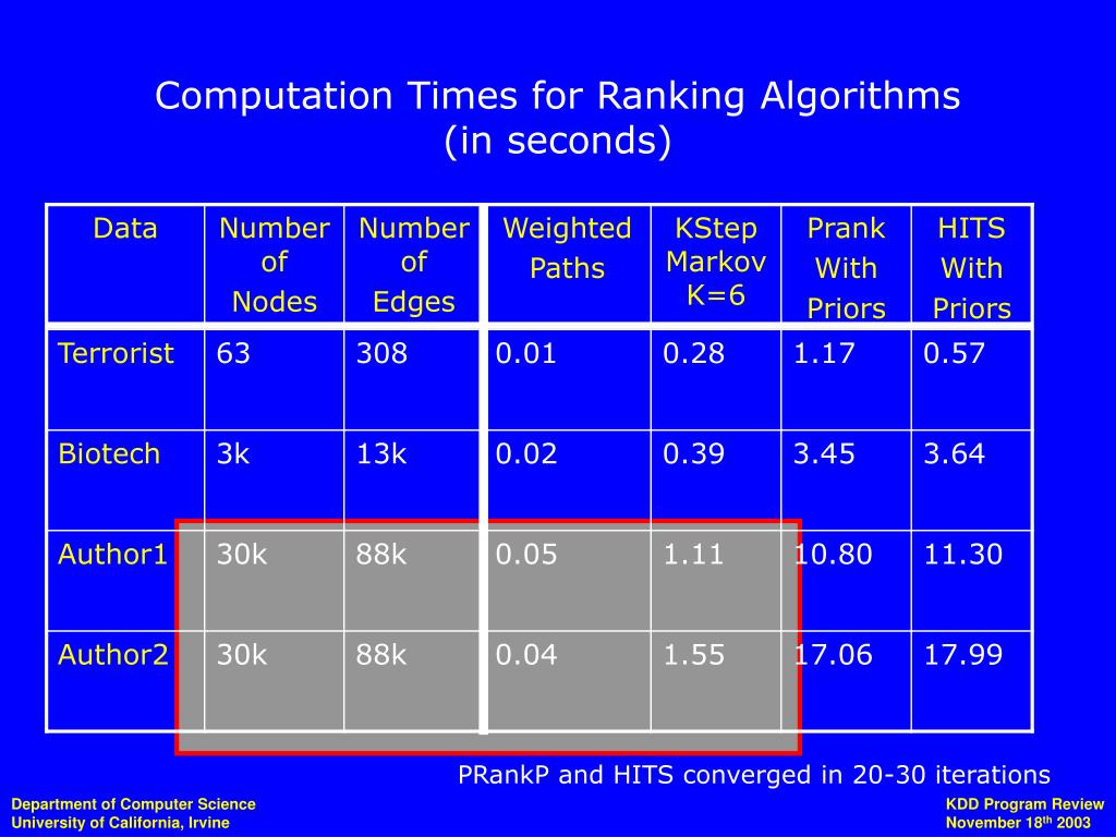 Computation Times for Ranking Algorithms (in seconds) PRankP and HITS converged in 20-30 iterations