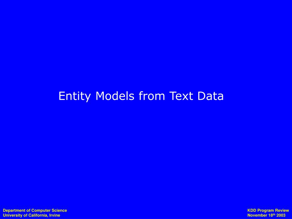 Entity-Based Data Mining fromSpatio-Temporal Events and Text Sources Presentation at KD-D Program Review, Nov 18-19 2003 Padhraic Smyth, Sharad Mehrotra Information and Computer Science University of California, Irvine {smyth, sharad}@ics.uci.edu www.datalab.uci.edu