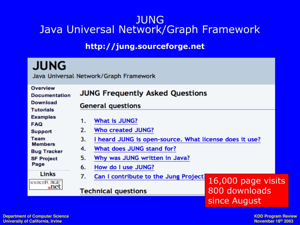http://jung.sourceforge.net JUNG Java Universal Network/Graph Framework 16,000 page visits 800 downloads since August