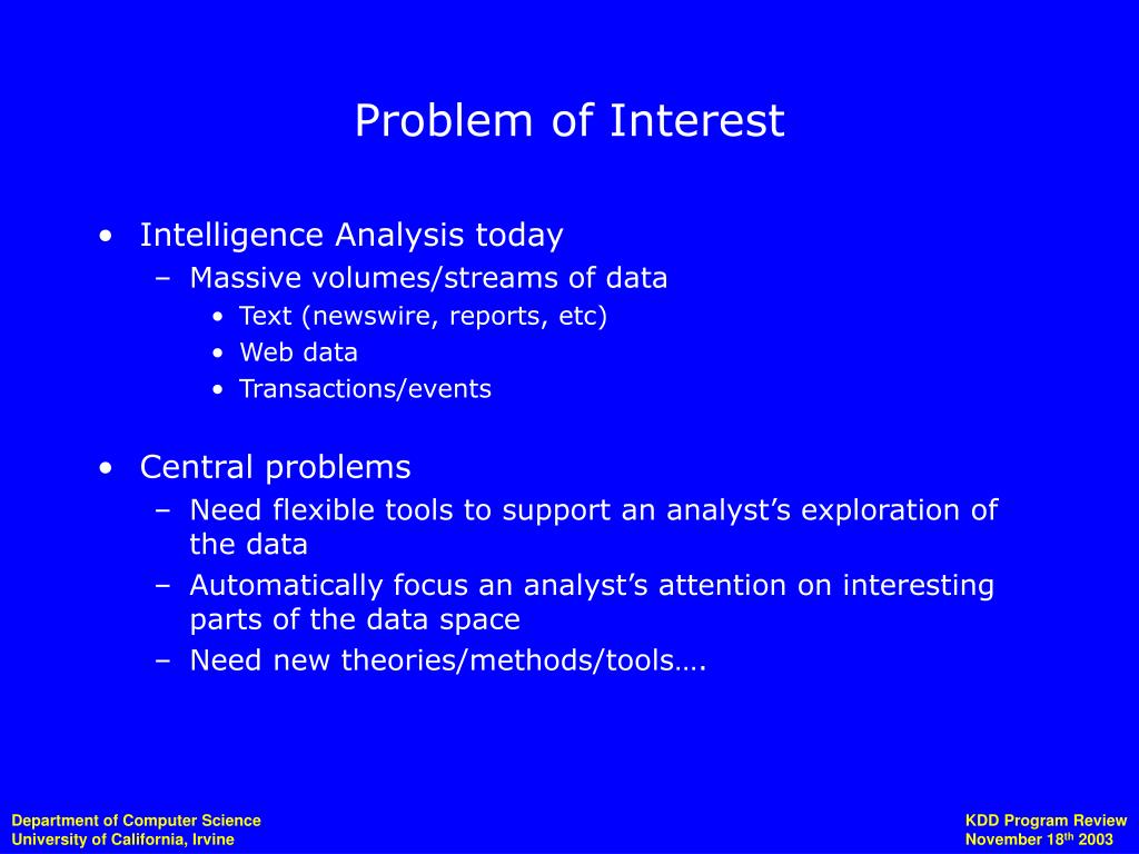Problem of Interest • Intelligence Analysis today • Massive volumes/streams of data • Text (newswire, reports, etc) • Web data • Transactions/events • Central problems • Need flexible tools to support an analyst’s exploration of the data • Automatically focus an analyst’s attention on interesting parts of the data space • Need new theories/methods/tools….