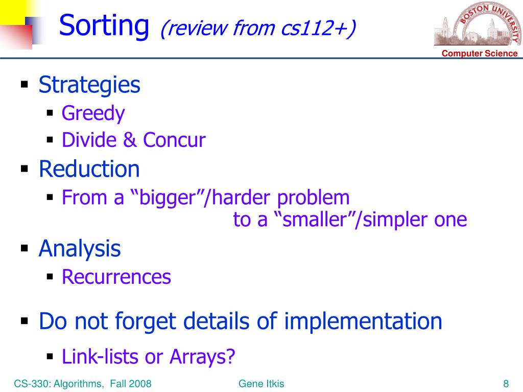 Sorting (review from cs112+) • Strategies • Greedy • Divide & Concur • Reduction • From a “bigger”/harder problem to a “smaller”/simpler one • Analysis • Recurrences • Do not forget details of implementation • Link-lists or Arrays? Gene Itkis